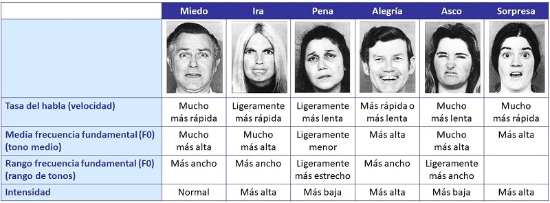 Se trata de la exposición de un trabajo ya antiguo, realizado por la propia Rosalind Pickard de la que hablábamos más arriba, y que relaciona las propiedades del sonido de la voz con las seis emociones de Ekman, que mencionábamos antes.