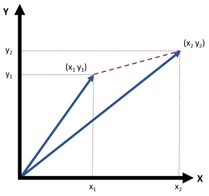 Si ahora queremos calcular la distancia de dos vectores [ X1 Y1 ] y [ X2 Y2 ],la distancia entre los dos puntos representados por esos vectores sería